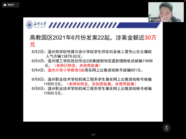 2022年2月23日晚上,在新学期,学院组织形势政策报告会——万象城awc官网登录入口2022年春季开学第一课暨安全教育专题讲座在腾讯会议上进行。本次报告会的主讲嘉宾万象城awc官网登录入口保卫处副处长钱合激老师,参加此次报告会讲座的有学院全体辅导员以及全院所有本研同学。学院学工办主任杨鹏老师主持了报告会讲座,介绍了本次报告会讲座的重要性以及的听课纪律。 首先,钱合激老师指出大学生常见的安全问题主要分为财产安全、人身安全、意识形态安全、反诈防诈、寝室消防安全、宗教知识教育等,共同建设和谐美好的平安校园需要全体同学的努力。钱老师结合最近万象城awc官网登录入口城内相关诈骗案件的最新情况,警示我们诈骗离我们并不遥远,除了电话诈骗和网络兼职诈骗,还要防范钓鱼网站的诱惑,提高警惕,防诈反诈。同时,他也向同学们介绍了网络诈骗的特点,常见的电信诈骗手段,讲解防诈骗常识,引导学生树立正确的消费观以及在生活中如何防止被套路贷等知识。钱老师通过经典案例、相关反诈宣传视频、图片,列举了电信网络诈骗犯罪的几种常见形式,有针对性地向同学们阐述了如何识别防范电信网络诈骗及上当后的补救措施,并号召同学们:电信网络与我们息息相关,我们要强化系统观念与法治思维,提升防范和辨别诈骗的能力和水平,推动建设更高水平的平安校园。 其次,钱合激老师通过消防安全、交通安全、户外活动、毒品伤害四块内容来讲述大学生的人身安全。学生宿舍是高密度人群居住的地方,防火安全显得尤为重要,作为宿舍的主体——学生,要重视安全防火的重要性,提高思想认识,防范胜于救灾,责任重于泰山。同时,钱老师还提到毒品的危害,这些年由于国际毒品的泛滥,毒品像一头张开血盆大口的猛兽,正飞快吞噬着年轻的一代,它无情的破坏着我们的家庭和社会,导致多少家庭家破人亡,国家财富流失。就此,钱合激老师向大家呼吁:人的生命只有一次,它是无价的,也是脆弱的,它承载着你的亲人、朋友和整个社会赋予你的责任,它承受不起任何不负责任的冒险,所以我们一定要珍惜生命,远离毒品。 最后,钱合激老师为大家讲了意识形态安全,他提到大学时代是大学生“三观”及信仰形成的重要时期,稍有不慎,宗教组织便有机可乘。所以我们应该时刻保持清醒的头脑和政治警觉性,不能对宗教渗透的消极影响视而不见或放任自流。此外,很多人都认为邪教离我们很远,甚至觉得自己不可能被邪教蛊惑。但在现实生活中,邪教组织其实套路百出、无孔不入。他们常常借用各种唬人的幌子包装自己,不断更新骗人花样,稍有不慎可能就会跌入邪教圈套。 “你的平安,是对家人最好的关爱!”生命只有在安全中才能永葆活力,幸福只有在安全中才能永具魅力。安全构筑了我们美好的家园,在安全的问题上,来不得半点麻痹和侥幸,我们必须防范在先、警惕在前;必须要树立高度的安全意识,人人讲安全,时时讲安全,推动建设更高水平的平安校园。