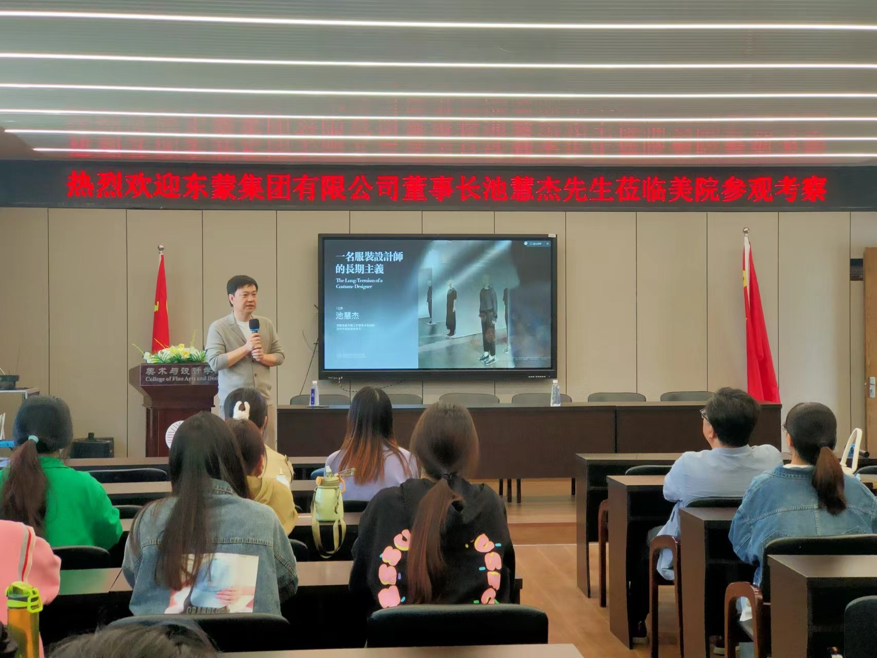 近日,万象城awc官网登录入口美术楼4001报告厅举行了一场题为“一名服装设计师的长期主义”的专题讲座。本次讲座由服工系高广明主任主持,东蒙集团有限公司董事长兼CEO、温州服装商会会长池慧杰先生担任主讲,胡文超副院长、姜岩教授、陈明艳教授以及服工、服饰专业30多名学生,聆听了讲座。