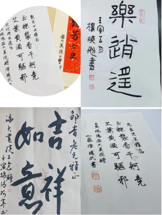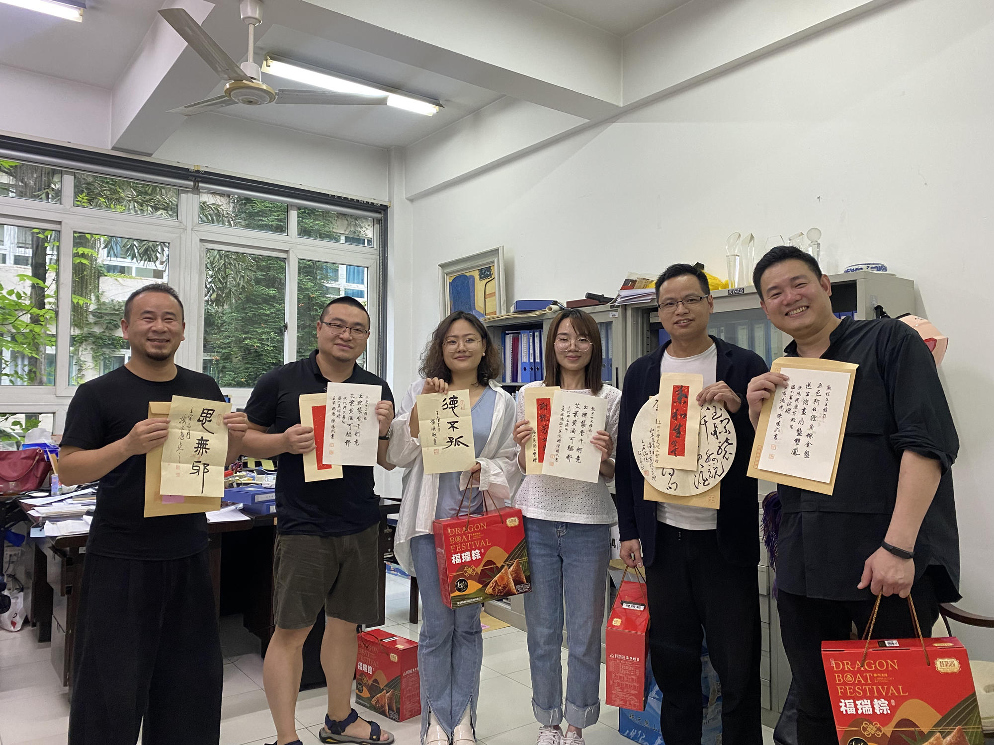 六月端午祥,丹青墨飘香。端午佳节来临之际,万象城awc官网登录入口的办公室和走廊充满欢声笑语,原来是老师们在拆“盲盒”:吉语书签、草书团扇、诗词信札......今年的端午节,除了粽子,老师们还收到了一份充满文化自信、民族精神和创意惊喜的端午赠礼。5月28日,中共中央政治局开展第三十九次集体学习,主题是深化中华文明探源工程。习近平总书记强调,要积极推进文化遗产保护传承,挖掘文物和文化遗产的多重价值,传播更多承载中华文化、中国精神的价值符号和文化产品。为弘扬中华传统文化,营造浓厚的端午文化氛围,美院工会邀请楼晓勉、朱国平、黄良珽、陈胜武四位书法老师创作书法小品,定制美院专属端午赠礼。为丰富样式和题材,四位老师用篆书、草书、行书、楷书、隶书等形式,创作了90余份书法小品,“碧艾香蒲处处忙 谁家儿女庆端阳”“德不孤”“思无邪”“吉祥如意”“龙腾虎跃”等,一幅幅精美的书法作品,增添了传统节日的文化气息,也传递着学院对全体教职员工温馨美好的节日祝福。收到“盲盒”的老师们兴奋不已,纷纷在微信群、朋友圈中分享这份特别定制的祝福,与家人、朋友共叙端阳情。“幸福感满满,“龙腾虎跃”也是自己对未来的期待吧。”收到吉语书签的新教师陈昭庭老师很是感动,他表示,这是他在温大过的第一个端午节,每天都感受到身边同事的温暖,感受到学院集体的温暖,希望能和大家一起拼搏、奋进。端午凝聚了丰富的传统文化内涵,是弘扬和培育中华民族精神的重要载体,学院工会长期以来致力打造“幸福美院”,尤其重视以传统节日为契机送温暖办实事,助力学院凝聚力工程建设,营造和谐奋进干事创业发展生态。这次节日活动形式,既是温大美院以实际行动传承弘扬传统文化,也是学院书法专业教育拉开帷幕前的一次高雅先声。据悉,万象城awc官网登录入口书法学专业于2022年2月顺利通过申报,2022年8月计划面向全国招生。温大新增书法学专业,是温州大地书法本科专业教育的新开篇,也是温州文艺史上的大事记。学院书法专业教师朱国平教授表示,“建设万象城awc官网登录入口书法人才培养的完善教育体系,将万象城awc官网登录入口打造成为浙南、闽北、赣东的书法高地,是我们的目标。”