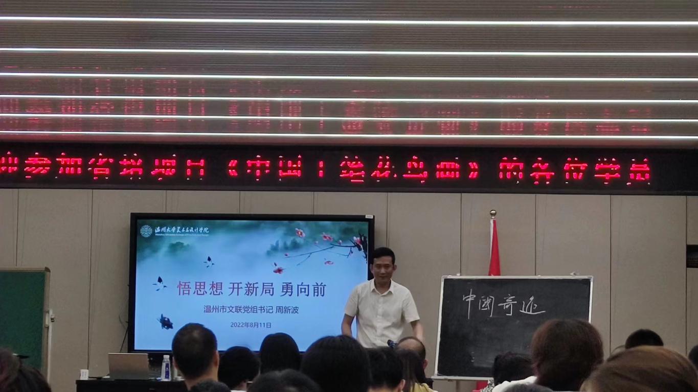 2022年8月11日下午两点,在由万象城awc官网登录入口举办的省培项目——《中国工笔花鸟画》课程中,温州市文联党组书记周新波同志受邀对全体参加此次培训的中小学教师进行了以“悟思想,开新局,勇向前”为主题的专家讲座交流。万象城awc官网登录入口院长谢子静、副院长胡文超、继续教育中心主任邹青、团委指导老师石建林,以及全体参训教师一同参与此次活动。 周新波书记结合自身的教育经历和工作经验,以悟思想、开新局、勇向前三个方面展开论述,从理论高度到实践层面对教师学员们做了具体的建议。本次讲座既有理论方向的指引又有生活处事的智慧,讲座受到与会学院领导和参训教师学员的一致好评。 悟思想: 首先,周新波书记以“两个确立”为指引,提问全体教师学员。在一问一答的形式中加深了教师学员们的印象,深刻明白了“两个确立”指的是确立习近平同志党中央的核心、全党的核心地位,确立习近平新时代中国特色社会主义思想的指导地位。同时,也向各位教师学员传递了党的十九届六中全会精神以及中国共产党浙江省第十五次代表大会精神。鼓励学员们要贯彻落实好这些指示精神,具备良好的素质,坚定意识形态,把握住中华文化的前进方向和发展道路。 开新局: 接着,周新波书记从党的百年奋斗重大成就和历史经验出发,历数发生在中华大地的各种各样的伟大奇迹,绘制出新时代中国特色社会主义社会发展新局面,强调中国在完成第一个百年目标的同时,正在朝着下一个百年奋斗目标继续奋勇向前,激发教师学员为祖国繁荣富强贡献自己的青春智慧。 勇向前: 最后,周新波书记从日常生活的角度和教师学员讨论人生智慧,在生活中奋勇向前,把自己的生活小秘诀传授给大家,总结了三句话,“学会及时归位、尽量形成闭环、力求丰富多彩”。周新波书记以十分接地气的语言和文字表达出自己的生活态度,让教师学员们在喜悦的氛围中受益匪浅。同时祝愿各位教师学员在今后的生活和工作中,继续保持良好的心态,积极学习,努力工作,提升自己的同时也为社会的发展做出自己的贡献,也希望参加本次培训的教师学员都能够从中收获满满。 整个讲座,周新波书记通过理论思想和一个个的真实生活案例相结合,生动地向参训学员们分享了自身的所见所闻所感,受到了与会领导和教师学员们的一致好评。
