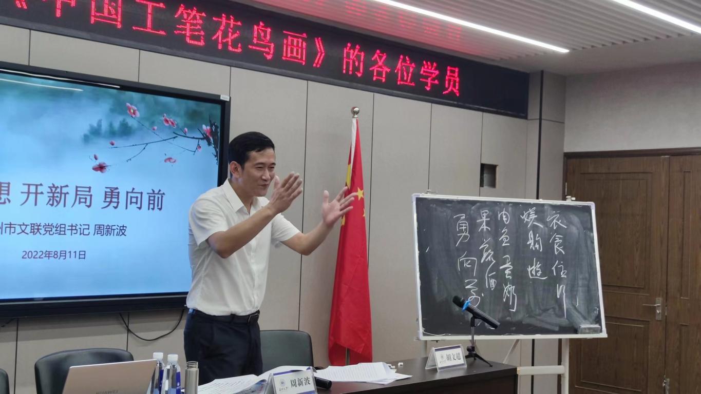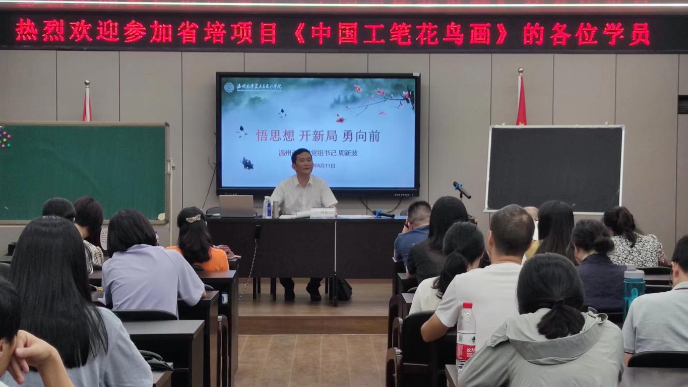2022年8月11日下午两点,在由万象城awc官网登录入口举办的省培项目——《中国工笔花鸟画》课程中,温州市文联党组书记周新波同志受邀对全体参加此次培训的中小学教师进行了以“悟思想,开新局,勇向前”为主题的专家讲座交流。万象城awc官网登录入口院长谢子静、副院长胡文超、继续教育中心主任邹青、团委指导老师石建林,以及全体参训教师一同参与此次活动。