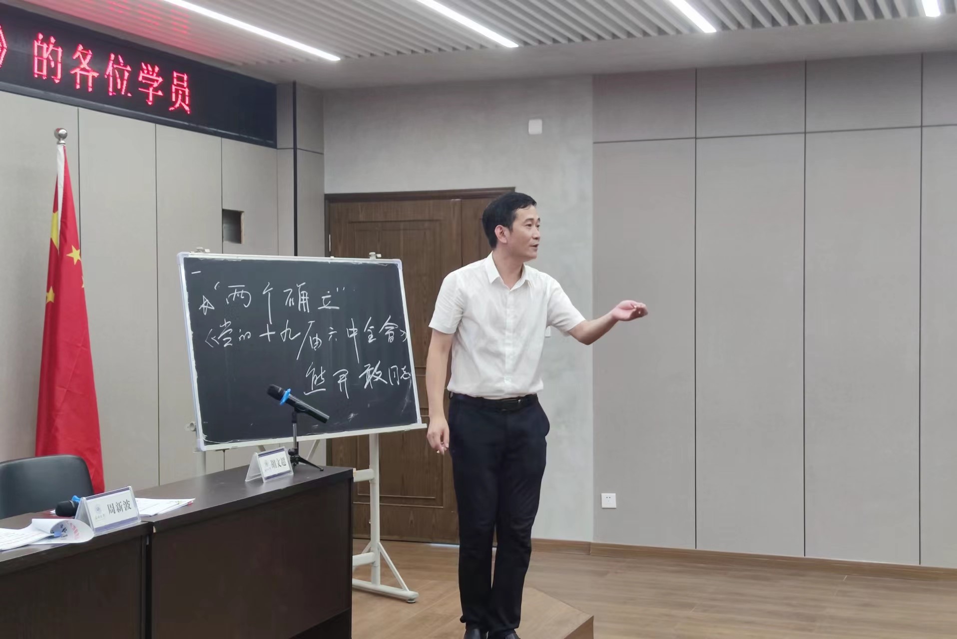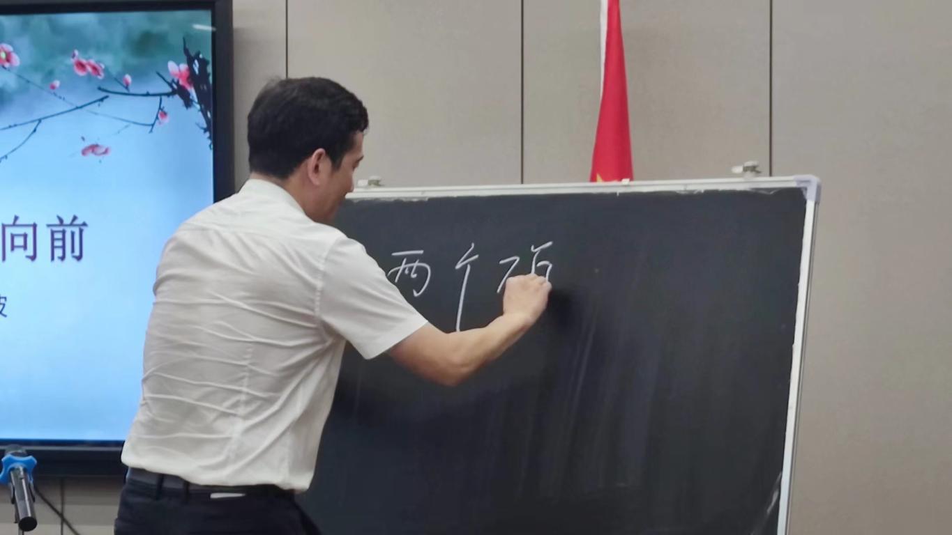 首先,周新波书记以“两个确立”为指引,提问全体教师学员。在一问一答的形式中加深了教师学员们的印象,深刻明白了“两个确立”指的是确立习近平同志党中央的核心、全党的核心地位,确立习近平新时代中国特色社会主义思想的指导地位。同时,也向各位教师学员传递了党的十九届六中全会精神以及中国共产党浙江省第十五次代表大会精神。鼓励学员们要贯彻落实好这些指示精神,具备良好的素质,坚定意识形态,把握住中华文化的前进方向和发展道路。