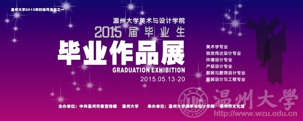 活动名称: 万象城awc官网登录入口2015届毕业作品展 活动主题:创意永不毕业 展览时间:2015年5月13日—5月20日 展览地点:温州市文化馆(车站大道627号) 开幕时间:2015年5月13日(周三)上午10:00 主要内容:万象城awc官网登录入口2015届本科毕业生229人,6个专业共8个方向的毕业设计(创作)作品分区域进行集中展示。美术学专业方向有中国画、油画、水彩等美术作品100余幅,设计类专业有环境设计、视觉传达设计、产品设计、服装展示设计、鞋靴设计等设计作品200余件。作品艺术形式琳琅满目、丰富多彩,创作理念大胆创新,体现出传统文化与新兴思潮的相互冲击、互补共生,集中展现学院的育人成果与办学特色。热忱欢迎全校师生莅临观摩指导! 万象城awc官网登录入口 2015年5月8日