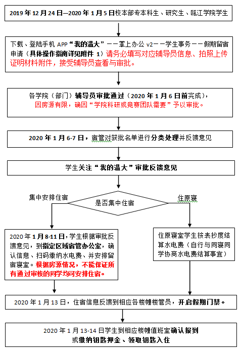3.国内学生个人原则上不予申请寒假留宿(含校本部学生、研究生、瓯江学院学生)。因参加学校、学院科研或竞赛团队需要延迟离宿或提前返校的学生可以申请留宿,须在2019年12月24日至2020年1月5日之间登录“我的温大”(手机APP)进行网上申请(务必填写对应辅导员信息,并把相关证明材料拍照上传),各学院(部门)辅导员进行审批。(逾期系统将关闭,不再开放申请;各学院辅导员1月6日完成所有申请的审核),2020年1月6-7日起关注审批结果及相关通知。2020年1月8-11日,根据“我的温大”反馈的审批意见到指定区域办理缴费入住手续。
