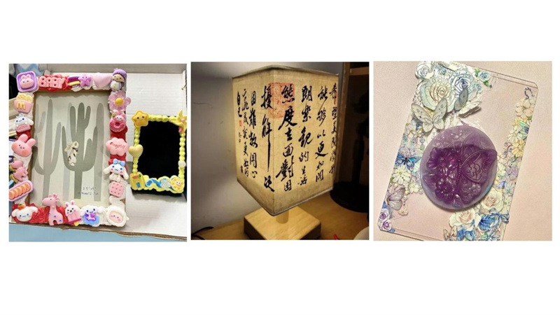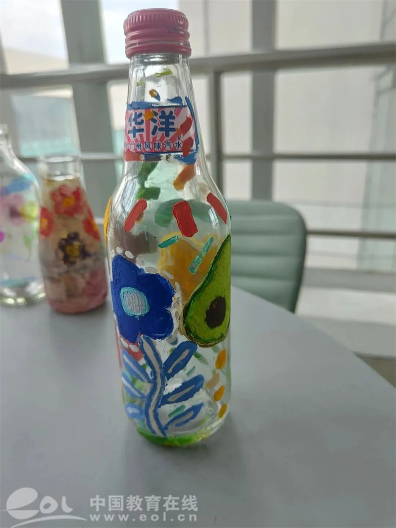 生活中随处可见美的存在。废弃的瓶瓶罐罐,只要用心装饰一番,既可以当作装饰摆件来欣赏,又可以用于生活收纳。同学们拿起颜料,挤出不同色彩,勾线、调色、上色、风干,描绘出一幅幅花卉、动物图案,精致的形状辅以绚丽的色彩,小小的DIY杯子点燃了美学创意和动手热情。在光照之下,玻璃瓶流光溢彩,治愈的色彩如彩虹音符般在学子的心灵上跳动……