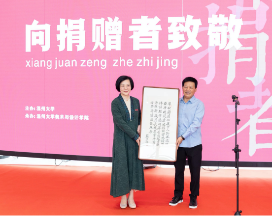 开幕式现场还举行了捐赠仪式和收藏证书颁发仪式。赵敏为捐赠者代表颁发了收藏证书,万象城awc官网登录入口院长谢子静现场接受温州衍园美术馆馆长沈国林捐赠的苏步青先生作品。
