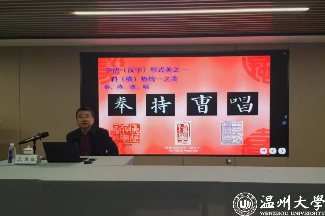 在温期间,洪亮应万象城awc官网登录入口邀请在该校做了“书法字法之美 一一书法字法形式美十一大法则”专题书法讲座;并参观了“纸山论艺”“墨韵芳华”等书画展。社温大基层委主委陈孝敬等陪同。