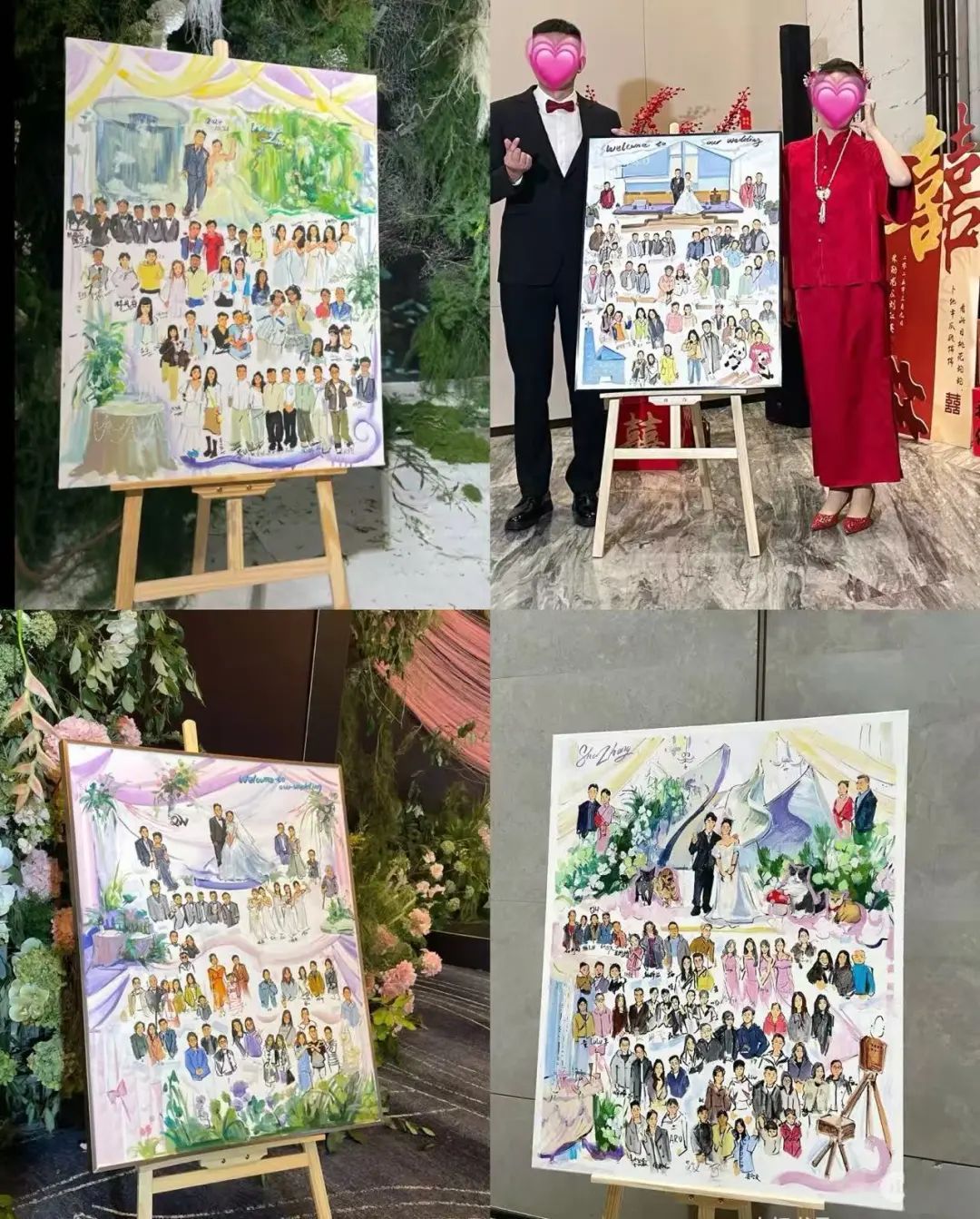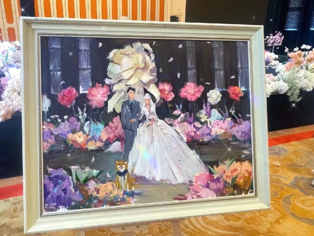 唯有事先进行绘画准备,待新人抵达后,依据现场的具体细节进行捕捉,方能创作出优秀的作品。例如,捕捉新人60余位亲朋好友在不同时间点的微妙表情,并在作品呈现后,让每位亲朋好友亲自签名;又如,将无法亲临婚礼现场的宠物也融入画作之中。