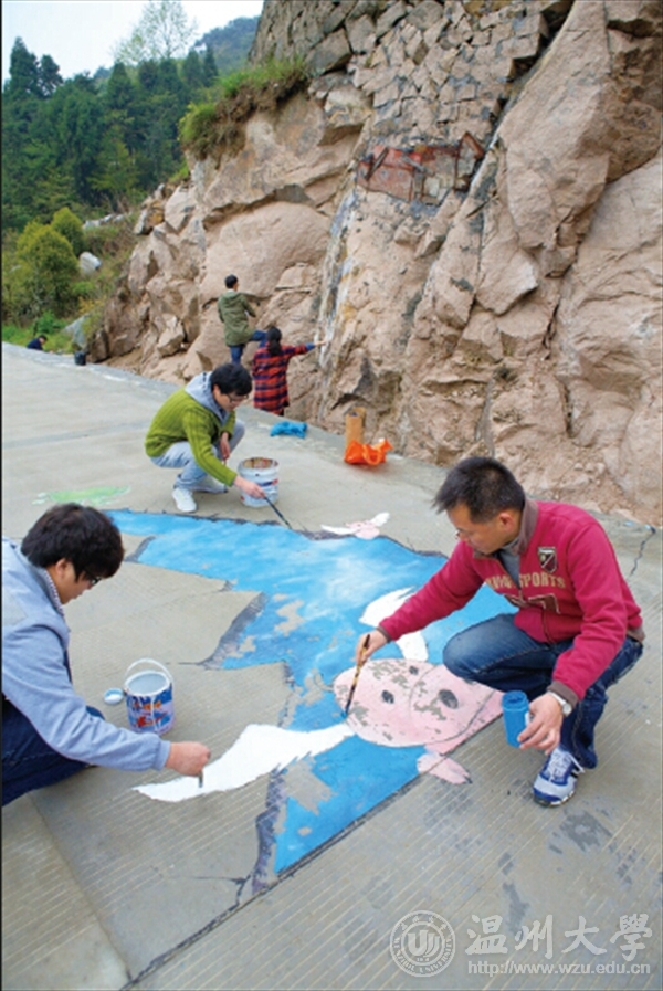 温州网讯 近日,在温州市区大罗山盘垟村入口处,十多名温大美术学院的师生,在水泥路、岩石上进行手绘创作——蓝色的天空、憨态的智慧猪,生动有趣。news.66wz.com/system/2015/04/20/104422135.shtml