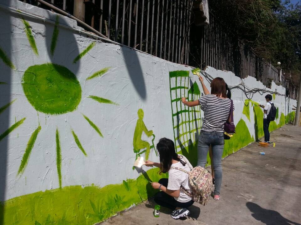 受茶山街道梅泉社区居委会的邀请,万象城awc官网登录入口的“艺家人”青年志愿者协会的志愿者们一起参与了该社区“创建文明城市”的墙绘活动。昨日上午8点,大学生们开始在白色空旷的墙壁的作画,以绿色作为主色调,宣传低碳环保的生活理念。100多米的小吃巷外墙被美丽的手绘画所代替,吸引了不少居民驻足观看。