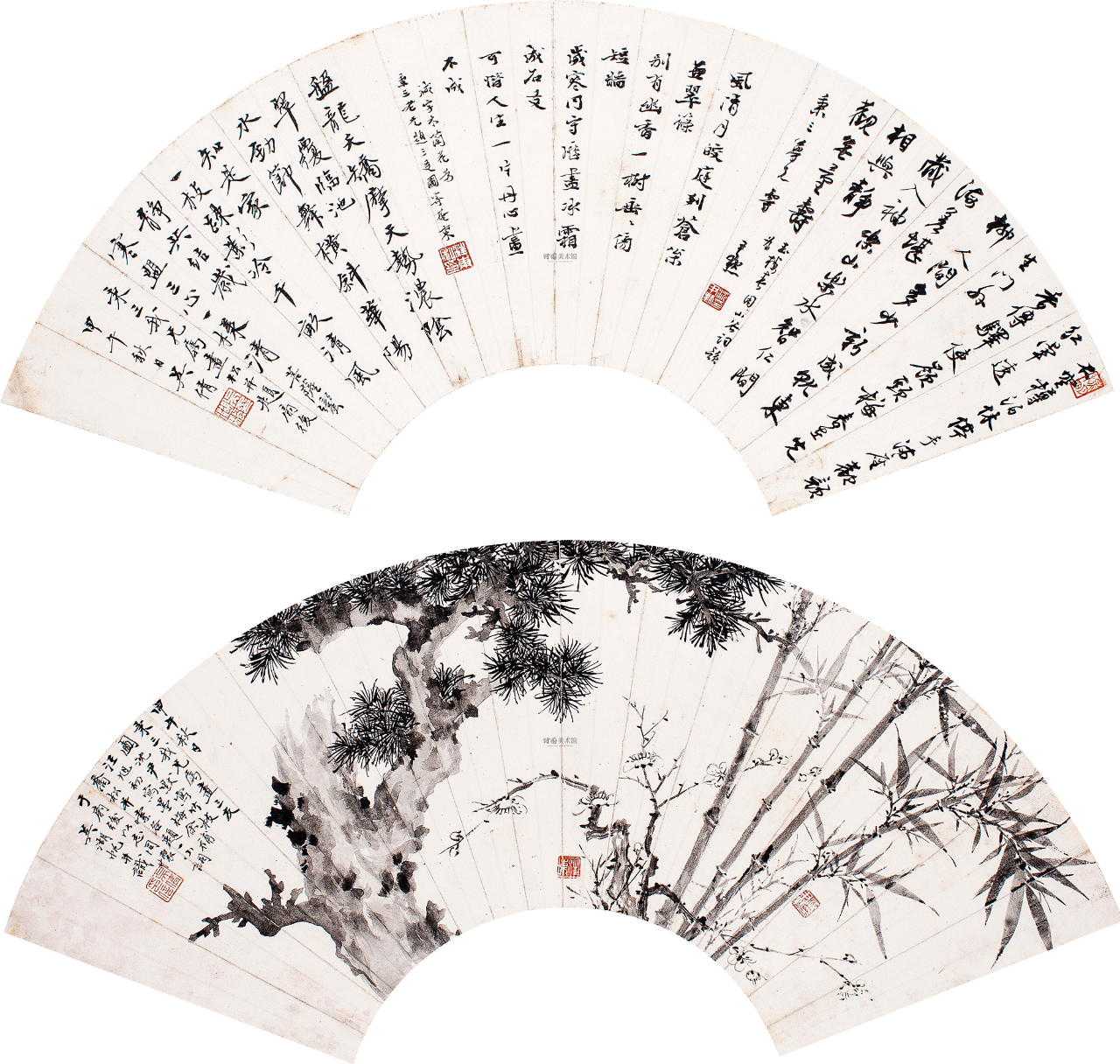 沈尹默、汪旭初、吴湖帆|三友图|扇面|18×55cm×2|水墨纸本|1954 年