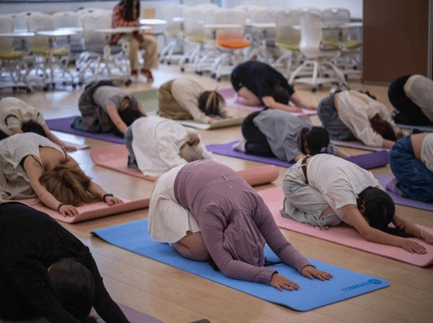 最后一个环节正念冥想。同学们平躺在瑜伽垫上,在林老师舒缓的引导语中,进入了深度的放松状态。大家仿佛置身于一个宁静的空间,抛开了外界的喧嚣和烦恼,只专注于自己的内心世界。冥想结束后,同学们缓缓睁开眼睛,脸上都带着平和的神情,纷纷表示自己的身心都得到了极大的放松。