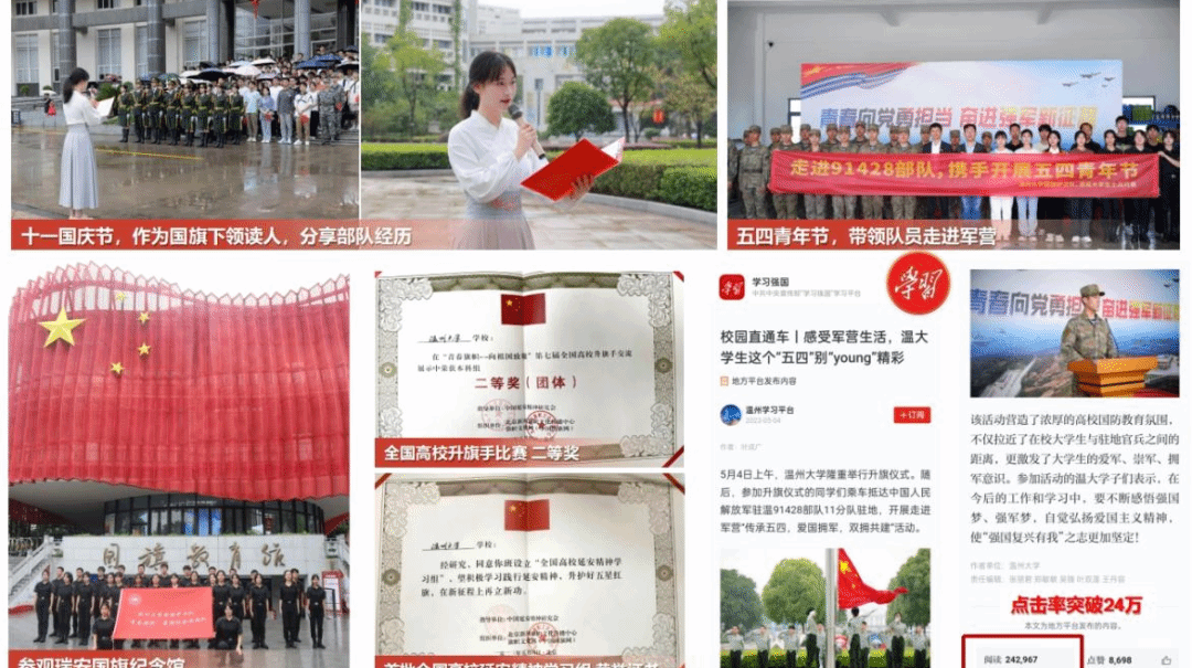 五四青年节,谢宛含带领队员走进军营,拉近了在校大学生与驻地官兵之间的距离,此次活动入围了温大2023校园好新闻,并在学习强国报道中突破24万点击量。十一国庆节,作为国旗下领读人,谢宛含分享部队经历,表达对祖国母亲的真挚祝福,再次获得了学习强国、教育之江、万象城awc官网登录入口、温大青年、温大学工等媒体报道。