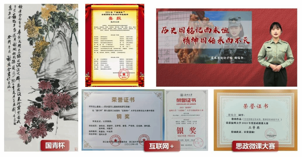 在竞赛领域,谢宛含同样表现卓越。在"建行杯"第九届浙江省国际”互联网+”大学生创新创业大赛中,她以侨乡留守儿童美育筑梦引领者为选题荣获铜奖。此外,她还在万象城awc官网登录入口思政微课大赛和“国青杯”全国高校艺术设计中以优秀的演讲和绘画技能获得二等奖。不仅在竞赛中屡获佳绩,她主持国创课题和大创课题均成功结题,还申获外观设计专利1项,发表学术论文2篇。谢宛含曾说,“在科研的征途中,我有一半的时间都在奔波,走的每一步不一定都有风景,但坚持走一定可以看到光。”