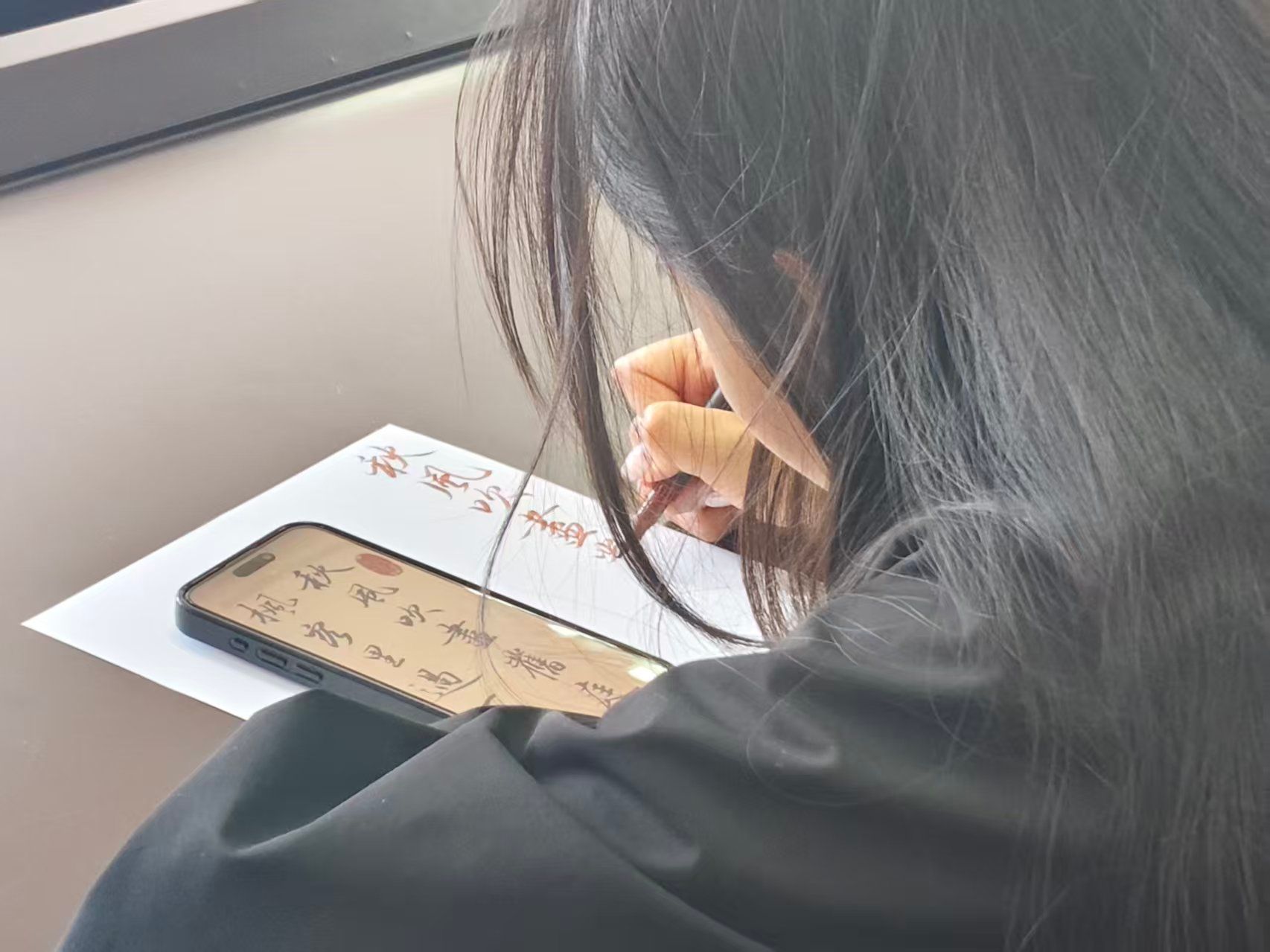 与此同时,野逸书画协会的同学们则以笔墨回应着古意。宣纸上,毛笔行走如龙,“冻笔新诗懒写,寒炉美酒时温”的诗句与枝头寒梅、水中残荷相映成趣。他们用传承千年的笔法,为现场注入了一份沉静而风雅的底蕴,仿佛在与古代的文人墨客隔空唱和。