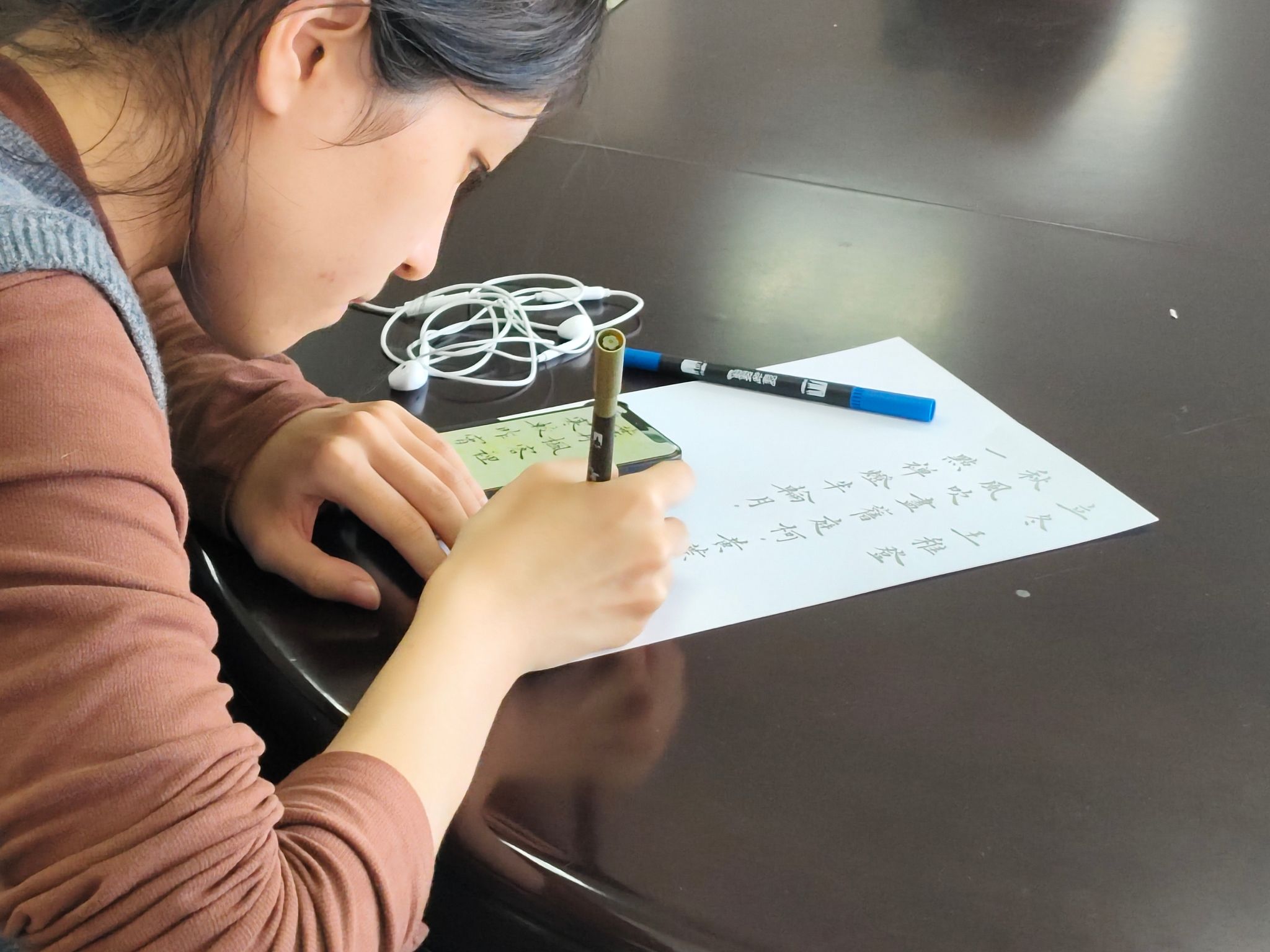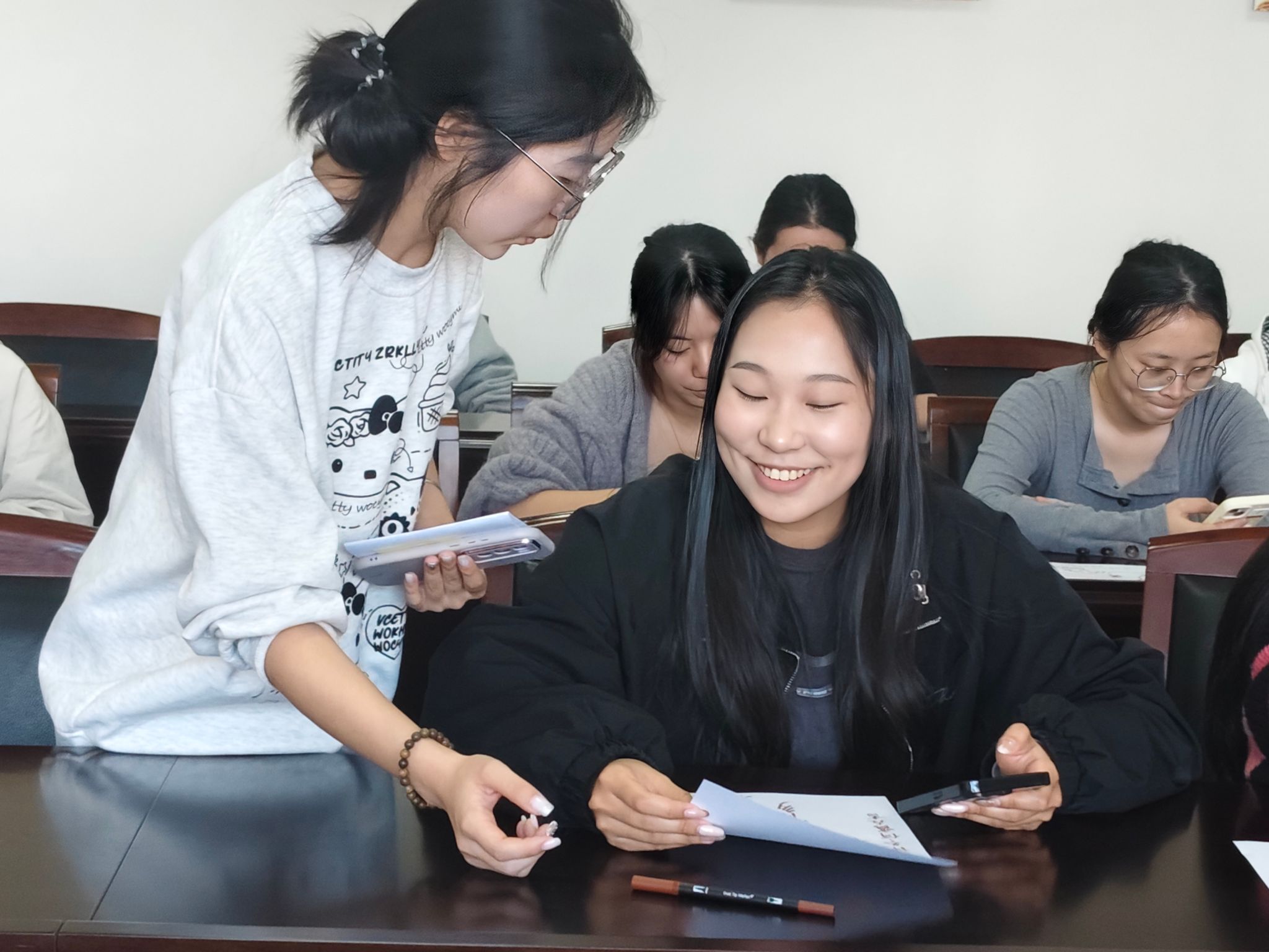 当个人的画作与集体的书法在展板上汇聚,活动进入了最温暖的分享环节。同学们围站在一起,讲述作品背后的心情故事。有人因一幅画而结识了有相似感受的新朋友,有人因一句诗而产生了深深的共鸣。笑声与掌声此起彼伏,艺术的表达在此刻成为了连接彼此的桥梁,驱散了冬日的微寒。