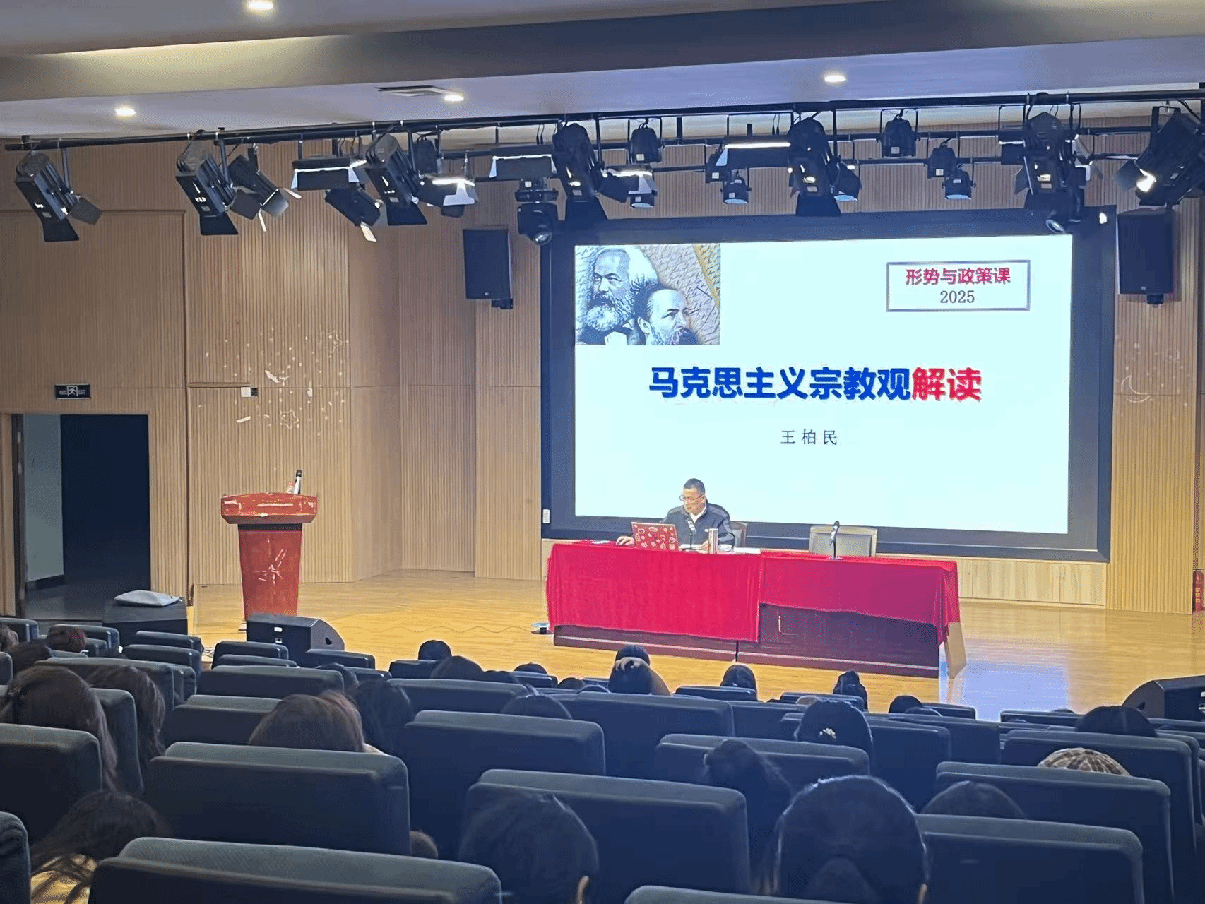 报告会上,王柏民老师围绕马克思主义宗教观的核心要义展开系统解读:从宗教的本质属性出发,结合马克思主义经典理论与当代社会实际,阐明宗教产生、发展的客观规律;详细解读党的宗教政策,强调“尊重宗教信仰自由,坚决抵制非法宗教活动”的核心原则;结合新时代中国国家安全观,指出非法宗教活动对校园环境、社会稳定的潜在风险。